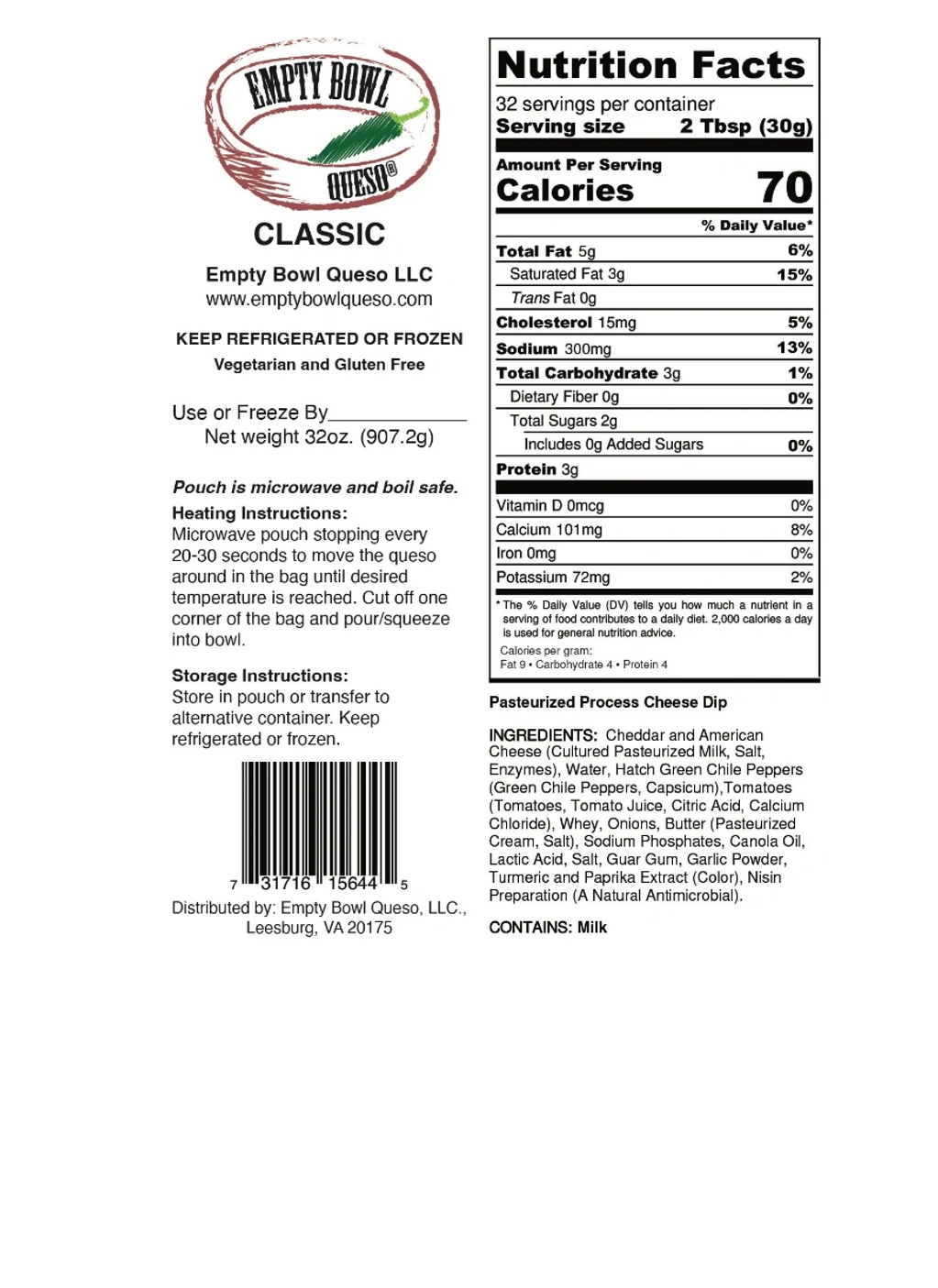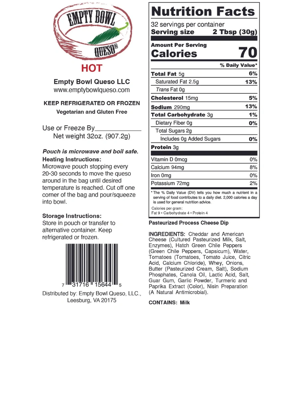 The Hot version of Empty Bowl Queso, starting with a sweet flavor followed with a good heat provided by 50% more Hatch NM Green Chile than the Classic version.